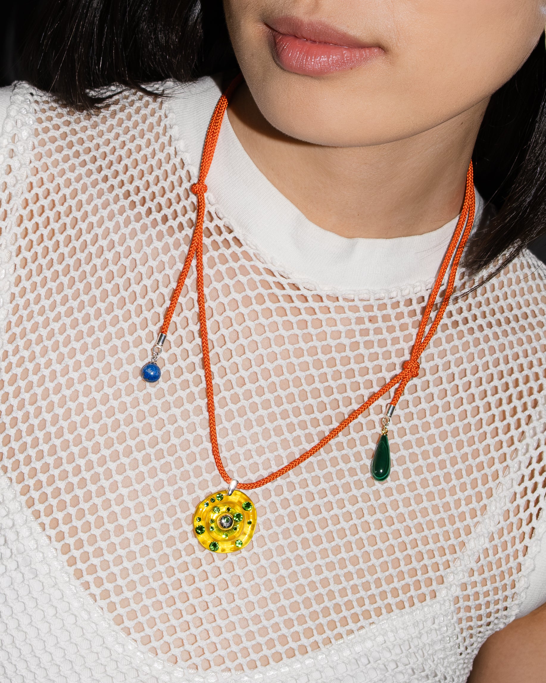 The SUN POWERS® Charm Necklace pairs deep blue lapis and banded green malachite with the collection’s handmade sensibility — precious yet cool.